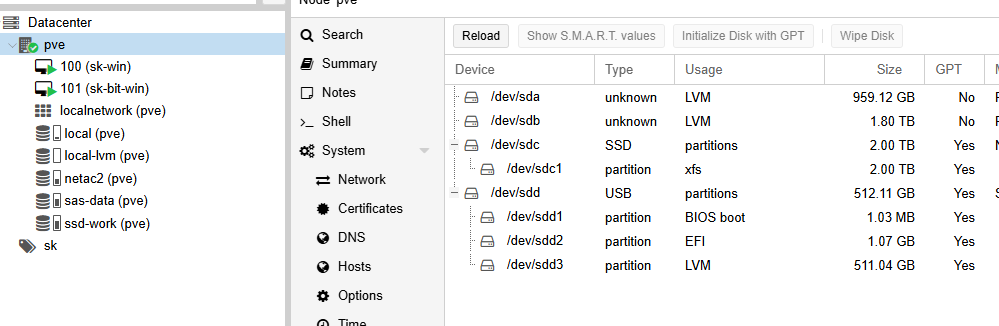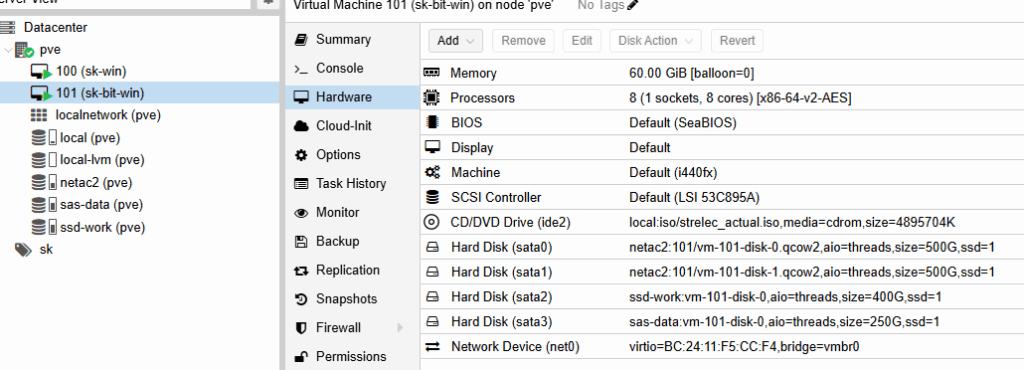 - Загружаемся на первом (sql + filedata) сервере под proxmox, добавляем в fstab наш внешний ssd на xfs, подключаем его в proxmox как папку. В ней создаём виртуальную машину с дисками в размер raid-0 массивов, которые я располагаю на ssd из тумбочки